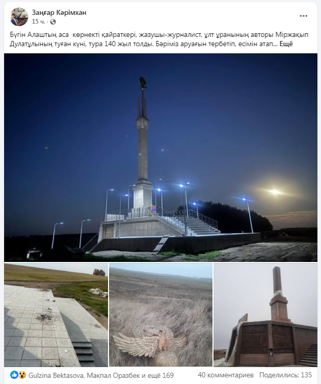 Belgili alashtanushy Zanghar Kәrimhan Soltýstik Qazaqstan oblysyndaghy Alash arystaryna arnalghan eskertkishti oblystyq әkimdikting búzyp tastaghany turaly ózining Facebook-tegi paraqshasynda jazypty. Biz atalghan jazbany qaz-qalpynda oqyrman talqysyna úsynyp otyrmyz...