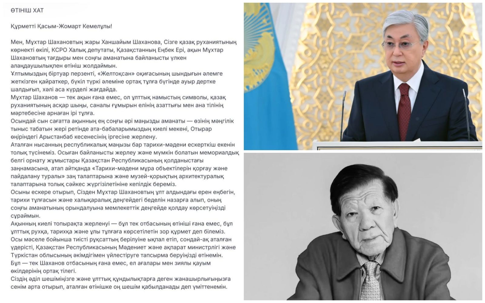 Мен, Мұхтар Шахановтың жары Ханшайым Шаханова, Сізге қазақ руханиятының көрнекті өкілі, КСРО Халық депутаты, Қазақстанның Еңбек Ері, ақын Мұхтар Шахановтың тағдыры мен соңғы аманатына байланысты үлкен алаңдаушылықпен өтініш жолдаймын.