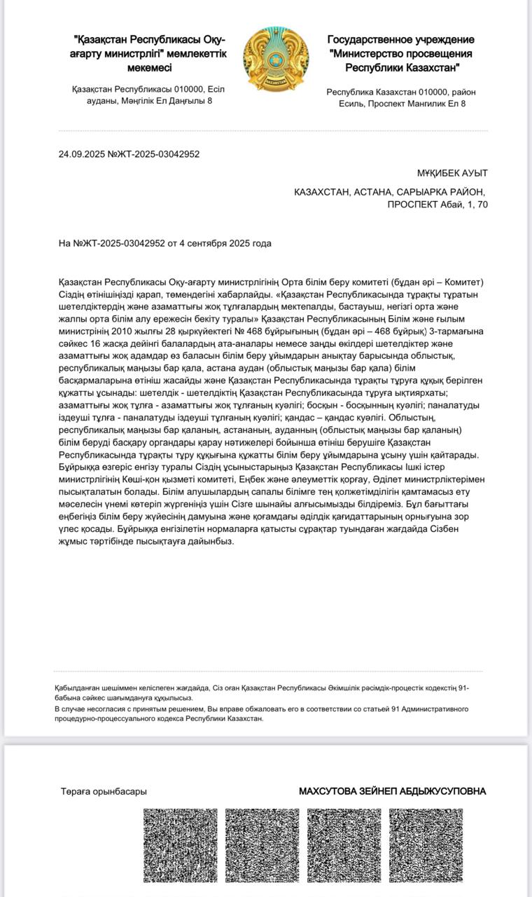 Жасыратыны жоқ, ол да Заң мен Бұйрықтағы қағидаттың сәйкес келмейтінін мойындағанымен, Қаныбек Жұмашев құсап, ол да Қазақстаннан оқығысы келетін Қазақстан Республикасының азаматтары болып табылмайтын ұлты қазақ балалардың амандығы мен қауіпсіздігін қайта-қайта айтып, қатты алаңдап отыр.