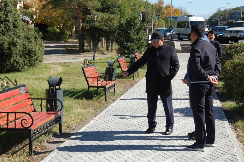 Ең алдымен облыс әкімі 2006 жылы орнатылған қазақтың үш тұлғасы – Ескелді би, Балпық би және Қаблиса жырауға арналған «Үш ата» монументін және оның айналасын абаттандыру жұмысын тексерді. Жөндеу жұмыстарының сапасына көңілі толмаған облыс басшысы мердігер ұйым «Qyran qurylysshy» ЖШС жұмысына сын жасады. Атап айтқанда, плитка төсеу, тротуар мен баспалдақ салу кезінде кемшіліктер анықталды. Мердігер компания директорының орынбасары Аслан Бекенов барлық ескертулер уақытында түзетіліп, нысан белгіленген мерзімде тапсырылатынын айтты.