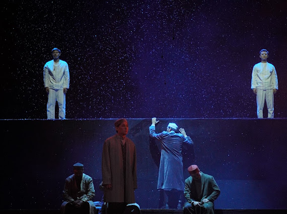 Қойылым театрдың этно-фольклорлық ансамблінің сүйемелдеуімен, Шәкәрімнің сазды әуендерін әуелеткен хормен бастау алады. Алғашқы сахна әке сүйегін құдық түбінен қазып алуға келген алпыс бір жастағы Ахат Шәкәрімұлы - Асылхан Төлепов мен Қабыштың – Мақсат Қабдеш диалогы.
