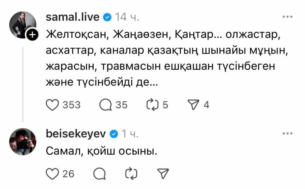 Ulysmedia порталының бас редакторы Самал Ибраева да қалыс қалған жоқ, оның сайтында күлдіргілерге қатысты жаға ұстатар материалдар жарияланып, ал Ибраева өзінің Threads парақшасында келесідей пост жазған: «Желтоқсан, Жаңаөзен, Қаңтар… олжастар, асхаттар, каналар қазақтың шынайы мұңын, жарасын, травмасын ешқашан түсінбеген және түсінбейді де…»