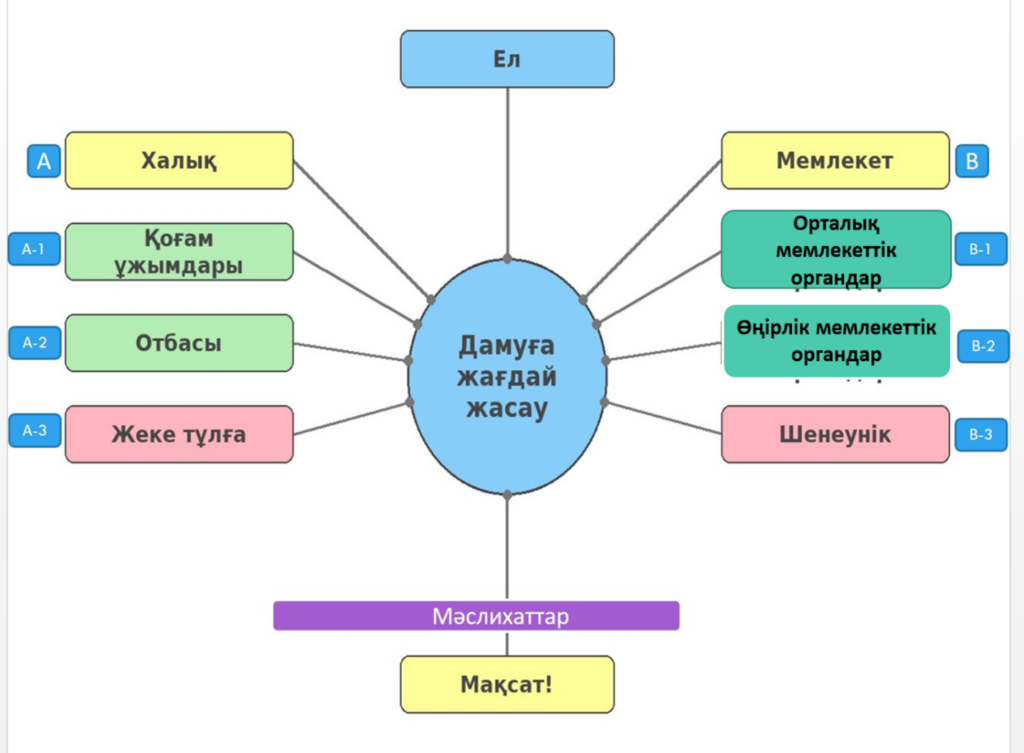 Нәтижесінде орталықта қалыптасқан «жағдай» (инфрақұрылым, құқықтық орта, мәдени климат) мақсатқа – ұлттың табысты, тұрақты дамуына жетелейді.