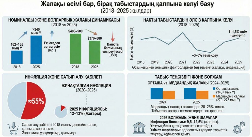 2025 жылға қарай орташа номиналды жалақы 340 мың теңгеден асты, яғни теңгемен екі еседен астам өсті, алайда долларлық баламада $370–380 деңгейінде қалып, 2018 жылмен салыстырғанда төмен болды. Бұл айырмашылық валюта бағамының әлсіреуі мен жоғары инфляциялық қысымның жинақталған әсерін көрсетеді.