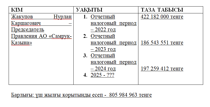 Енді, сөз соңында оқырмандардың есіне «Самұрық‑Қазына» қорын кімдер басқарғанын және Нұрлан Жақыповтың табысы туралы берген есебін еске сала кетуді жөн көрдік: