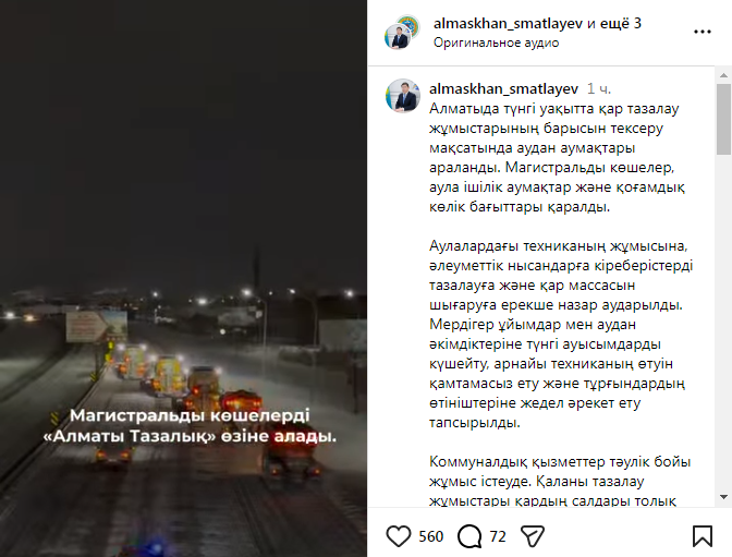 Әсіресе аулаларда жұмыс істеп жатқан техниканың тиімділігіне, әлеуметтік нысандарға кіреберістердің ашық болуына және жиналған қарды дер кезінде шығаруға басымдық берілді. Мердігер компаниялар мен аудан әкімдіктеріне түнгі ауысымдарды күшейту, арнайы техниканың кедергісіз қозғалуын қамтамасыз ету және тұрғындардың өтініштеріне жедел жауап беру нақты тапсырылды.