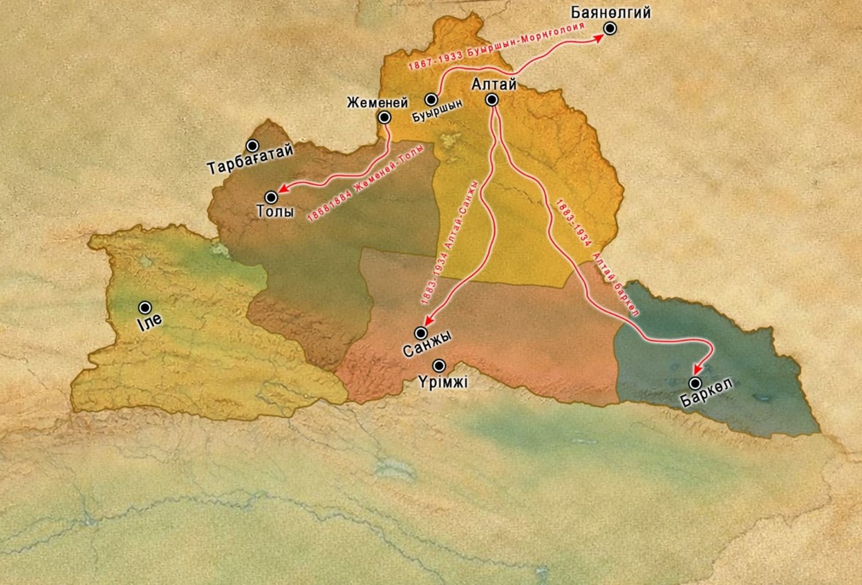 1860 жылдардың соңында басталған Алтай қазақтарының Тәңіртауға , Тарбағатайға көші – Қазақ хандығының жойылуына байланысты Ресейдің шығысқа ірге кеңейтуі, Цинь империясының құлдырауына байланысты болған. Сонымен қатар жоңғар хандығының жойылуына байланысты қазақтардың бейбіт өмірі, халық санының қаурыт өсуінеде байланысты болып табылады. Осы көш нәтижесінде қазыргі күнде 300-450 мың қазақ қоныстанған Тәңіртау аймағы яғни Санжы облысы, Үрімжі маңы мен Баркөл ауданы қазақтары қалыптасты, 18 ғасырдың ортасыннан кейінгі Алтайға көшті Қожаберген батыр мен Ер Жәнібек бастаса, бір ғасырдан кейін Тәңіртауға көшуде көштің негізгі тобын Бөке батыр Жырғалаңұлы бастады.