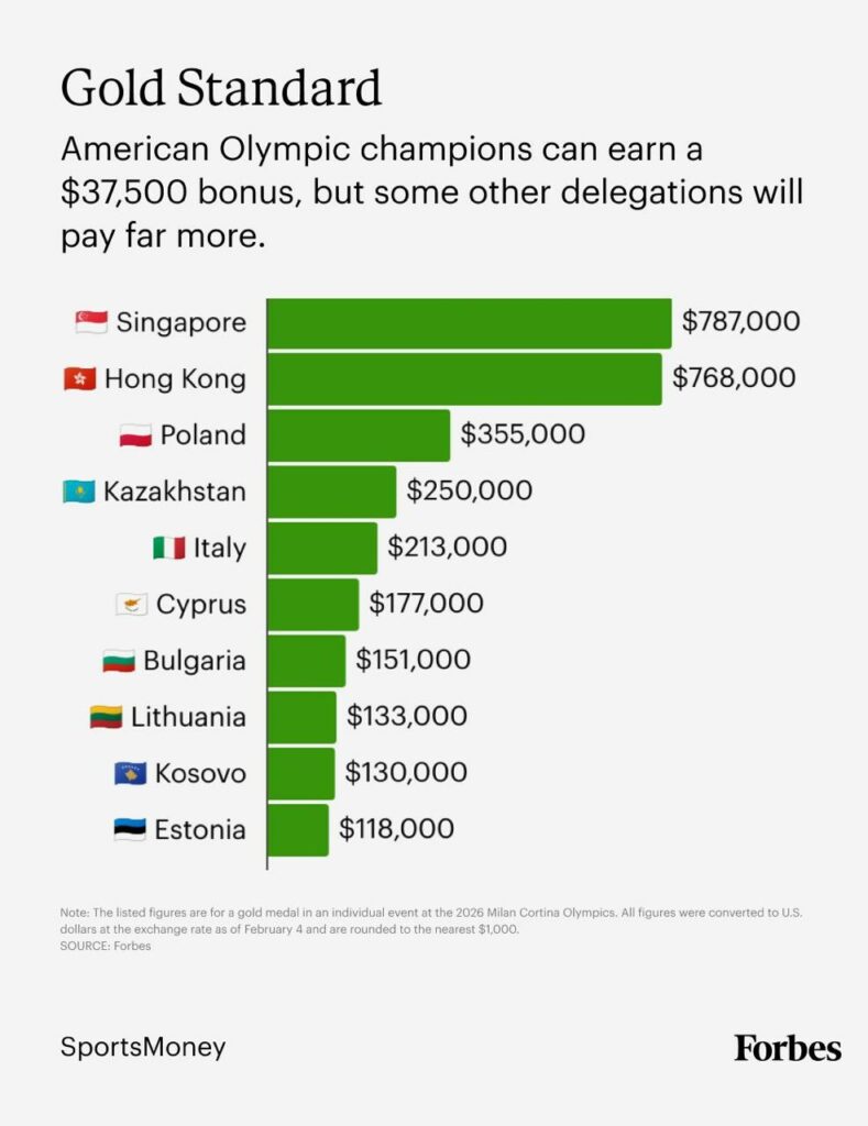 Forbes мәліметтері бойынша, ең төменгі төлемдер Жаңа Зеландияда. Мысалы, мұнда жеңіске жеткендерге шамамен 3000 доллар беріледі. Ал ең жоғарғы сыйақы көрсеткіші Сингапурда, онда Олимпиада чемпионы 787 000 долларға дейін ала алады. Бұл қатарда Гонконг (768 000 доллар) және Польша (355 000 доллар) да бар.