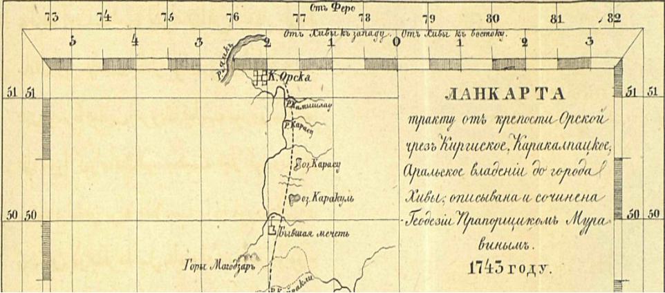 Қазақ жұртының Арал теңізі мен Сырдария маңындағы қоныстары туралы ертедегі тарихи жазбалардың бірі – 1740 жылы Ор (Орынбор) қаласынан қазақ даласы арқылы Хиуаға сапар шеккен патшалық Ресейдің әскери қызметкерлері поручик Д.Гладышев пен прапорщик, геодезист Муравиннің күнделігі. Олар қазақ жұрты мен қатар Хиуаны билеп отырған Әбілқайыр ханның патша үкіметінен Сырдария бойында қала салып беру өтінішін орындау мақсатында келеді. Сапарнама нәтижесінде геодезист Муравин сапардың ланкартасын сипаттаған жазба жасайды. Соның негізінде және одан кейінгі жүргізілген экспедициялардың деректерін басшылыққа ала отырып ХІХ ғасырдың орта шенінде патша үкіметінің әскери қызметкерлері Ор қаласы мен Хиуа өлкесі аралығындағы трактаттың (күре жолдың) сызба картасын кестелейді (сурет 1).