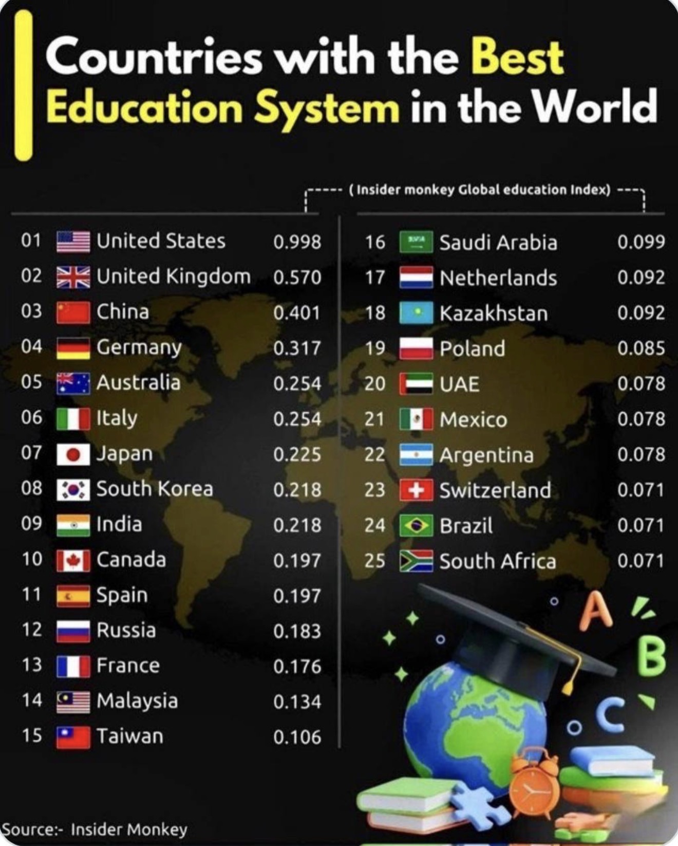 Insider Global Education Index рейтингі бойынша Қазақстан 218 ел мен аумақтың ішінде 18-орынға ие болып, әлемдік ТОП-20 қатарына енді.