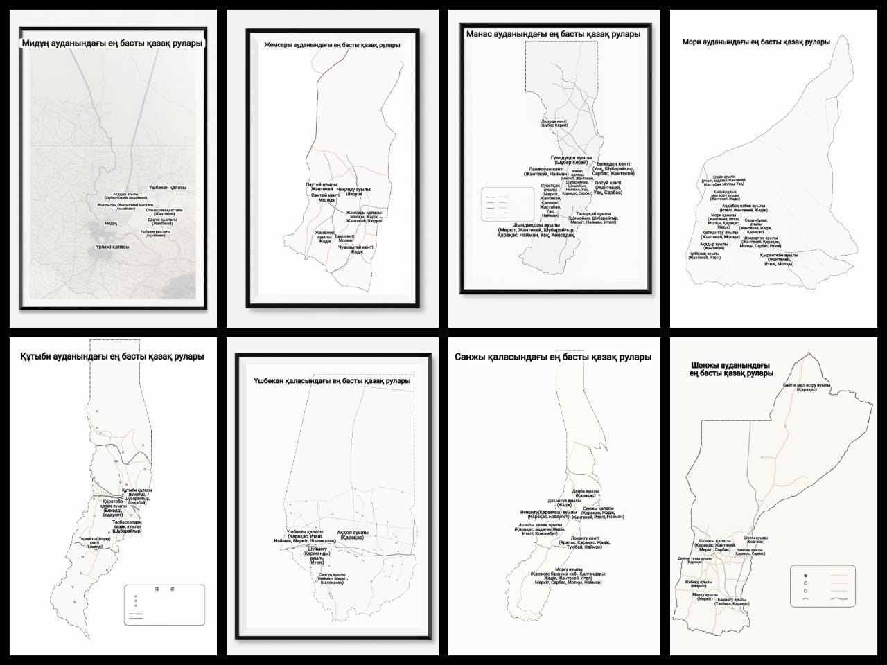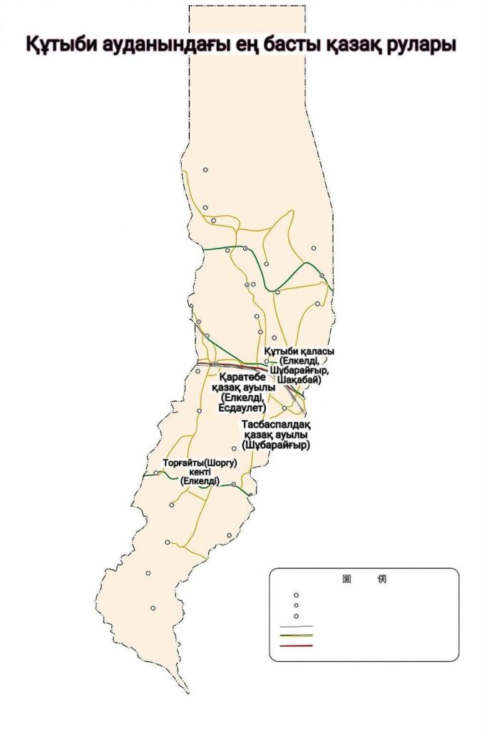 - قۇتىبي قالاسىنا كوركەم(شيجيڭ), ءسۋتاس(شۇيجيڭ), قوسباستاۋ(شۋاڭيۋان), قازىنا(باۋچىڭ), تاسبۇلاق(چيڭچۋان) قاتارلى 16 مولتەك اۋدان قارايدى. ەڭ باستى رۋلارى – ەلكەلدى، شۇبارايعىر، شاقاباي.