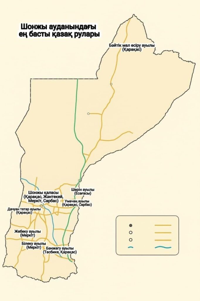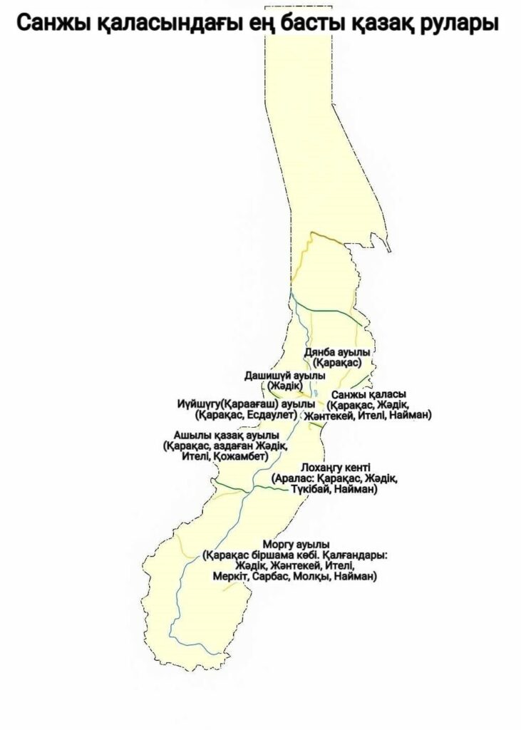 قازاق وتە از تۇراتىن كونە شونجى، دۇڭۋان، شيدي، سانگۋجۋاڭزى، شيبيۋان، جيجيحۋ كەنتتەرى مەن كارىز، گۋچىڭ، شيحۋ اۋىلدارىنا توقتالمادىق. 2020 جىلعى ۇكىمەت ساناعى بويىنشا بۇل اۋداندا 27 مىڭ 200 قازاق بولعان. قورىتا كەلگەندە، شونجى اۋدانى قازاعىنىڭ تەڭ جارتىسىن قاراقاس رۋى، 21 پايىزىن مەركىت رۋى، 14 پايىزىن ەساعاسى رۋى ۇستايدى.