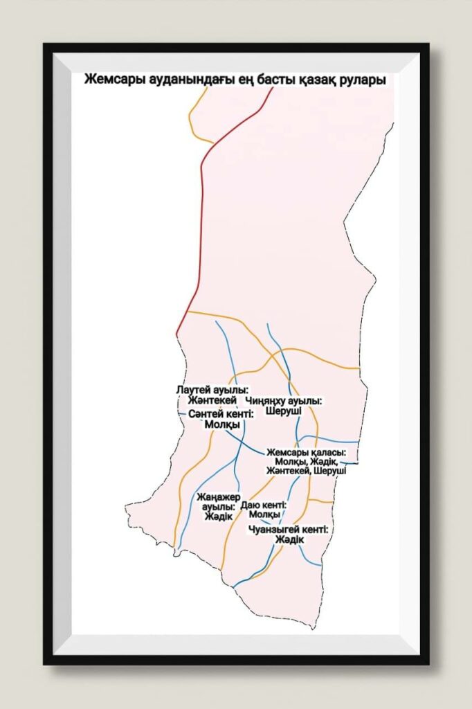 - جەمسارى قالاسىنا قوعاجاي(ۋيحۋشياڭ), شۇرشىتقورعان(مانچىڭلۋ), مادەنيەت، تاتۋ، وركەنيەت قاتارلى 10 مولتەك اۋدان مەن اقبۇلاق، قۇماعار(شاحى), ويىنكول(جياۋچاڭحۋ) قاتارلى 6 ەلدى مەكەن قارايدى. ەڭ باستى رۋلارى – مولقى، جادىك، جانتەكەي، شەرۋشى.