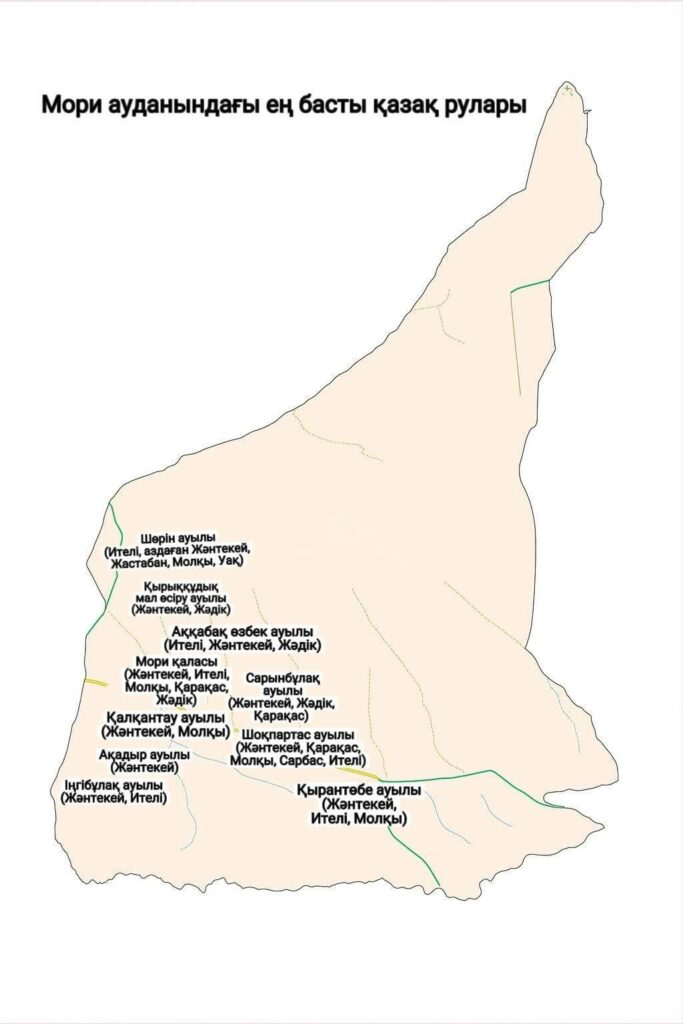 قازاق وتە از تۇراتىن شيجير، شينحۋ كەنتتەرىنە توقتالمادىق. ۇكىمەت ساناعى بويىنشا 2020 جىلى بۇل اۋداندا 25 مىڭ 498 قازاق بولعان. قورىتا كەلگەندە، موري قازاق اۆتونوميالى اۋدانى قازاعىنىڭ 39 پايىزىن جانتەكەي(شاقاباي، قازىبەك، سەكەل، بارقى، ەساعاسى), 27 پايىزىن يتەلى رۋى، 13 پايىزىن مولقى رۋى، 10 پايىزىن قاراقاس رۋى ۇستايدى.