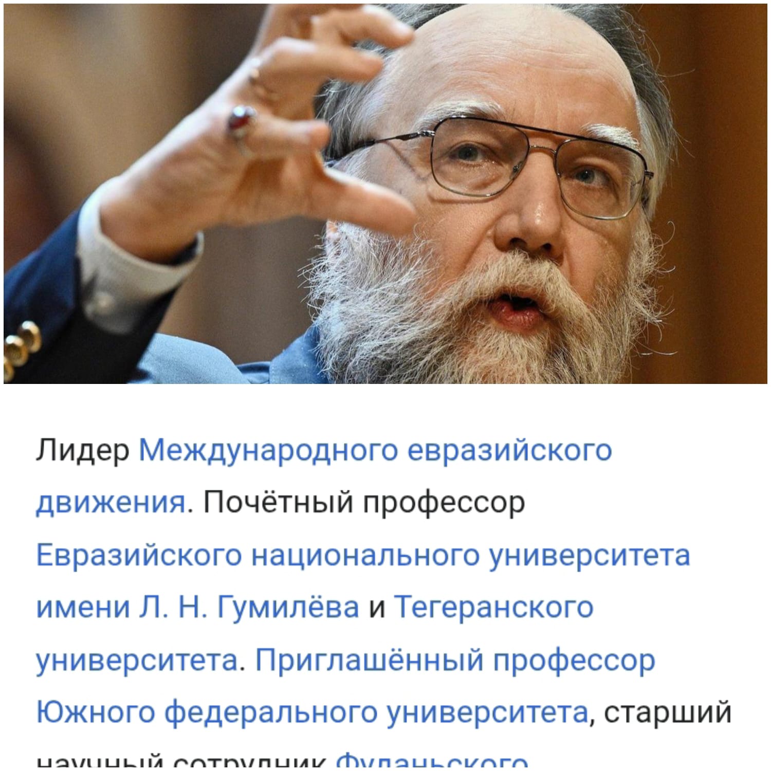 «دۋگين – حالىقارالىق ەۋرازيا قوزعالىسىنىڭ كوشباسشىسى. ل.ن. گۋميلەۆ اتىنداعى ەۋرازيا ۇلتتىق ۋنيۆەرسيتەتىنىڭ قۇرمەتتى پروفەسسورى» دەپ تايعا تاڭبا باسقانداي جازىلىپ تۇر.